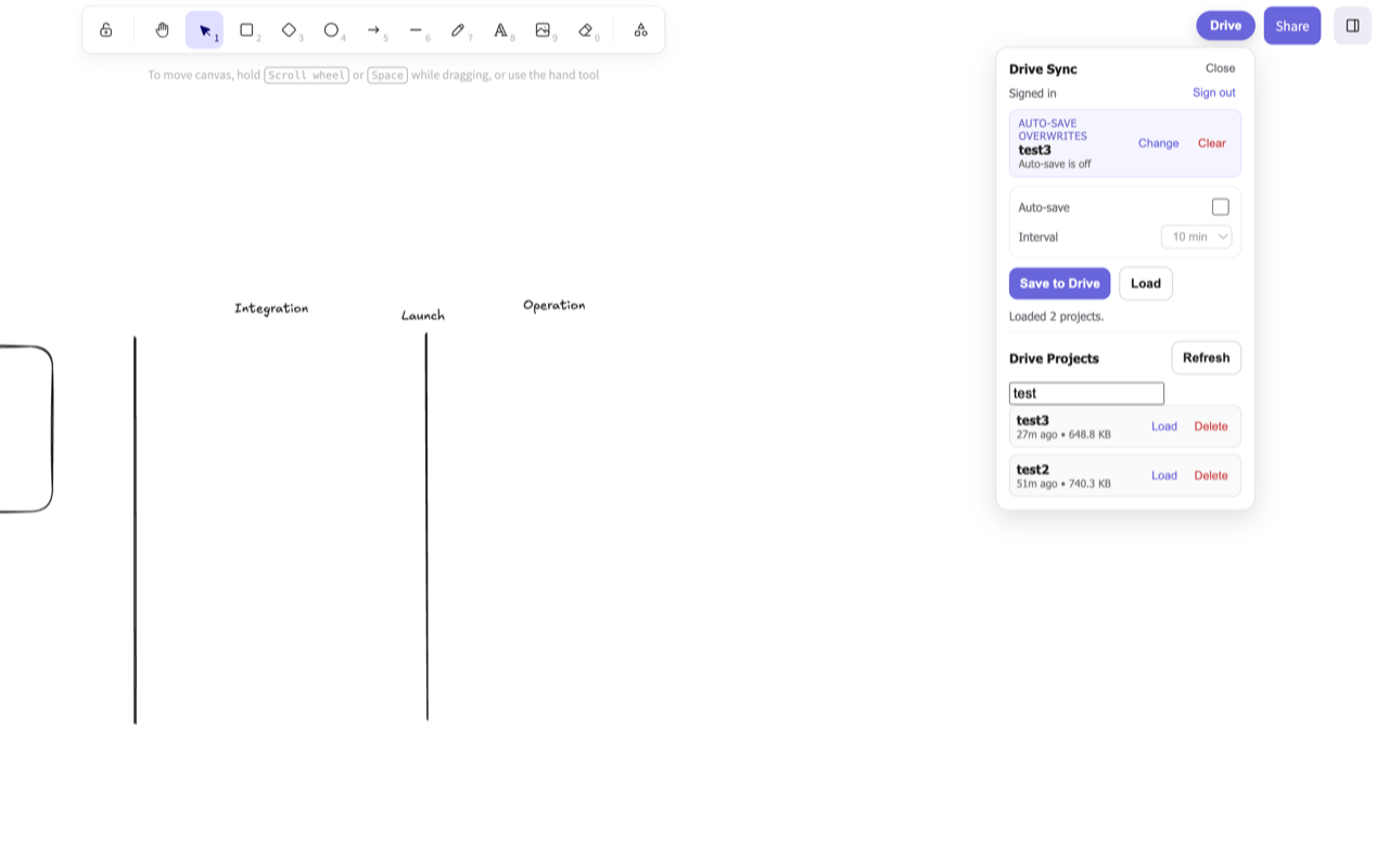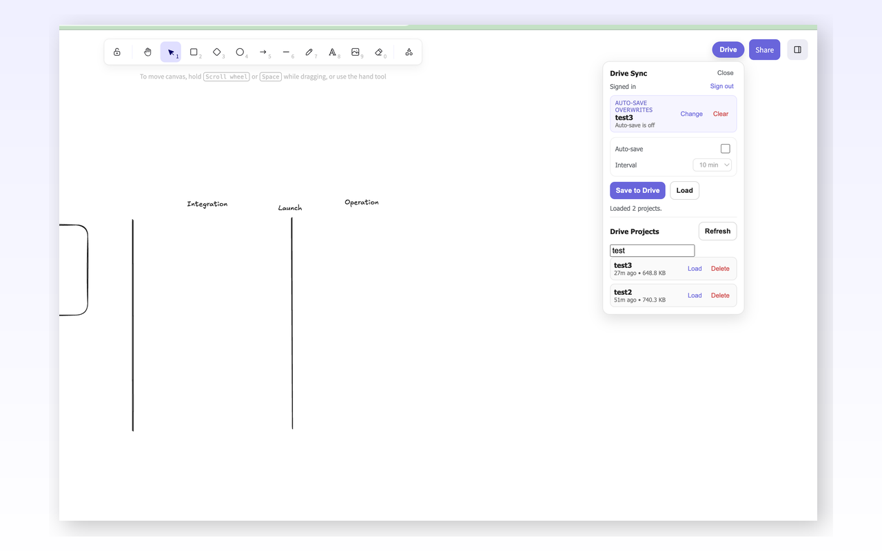 Open Excalidraw and you'll see a new Drive menu. Save drawings or enable auto-save.